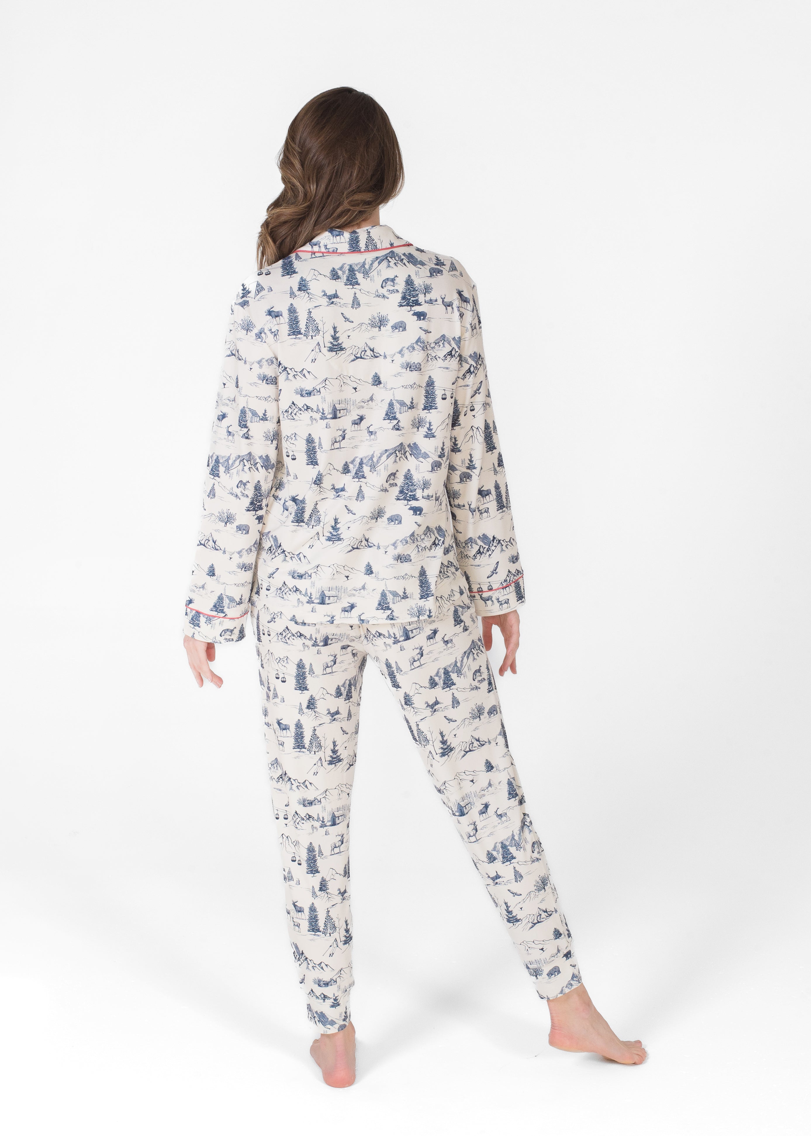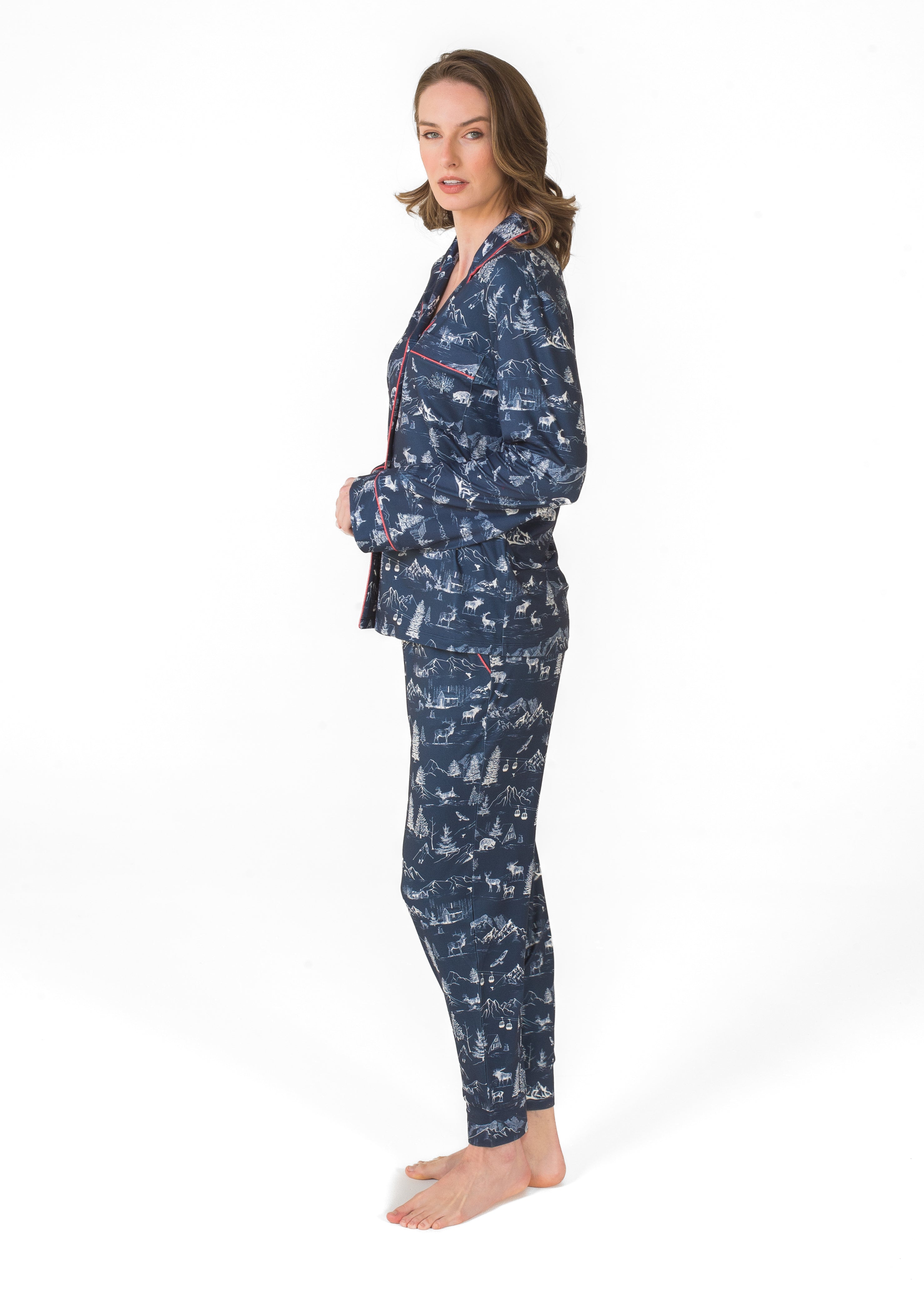 Experience luxurious relaxation with this long-sleeve notch collar pajama jogger set. The super soft finish of the top, adorned with a button front closure and contrast piping, pairs perfectly with the jogger pants featuring matching piping, side seam pockets and a comfortable fit. Elegantly packaged, it's an ideal gift for indulgent comfort.